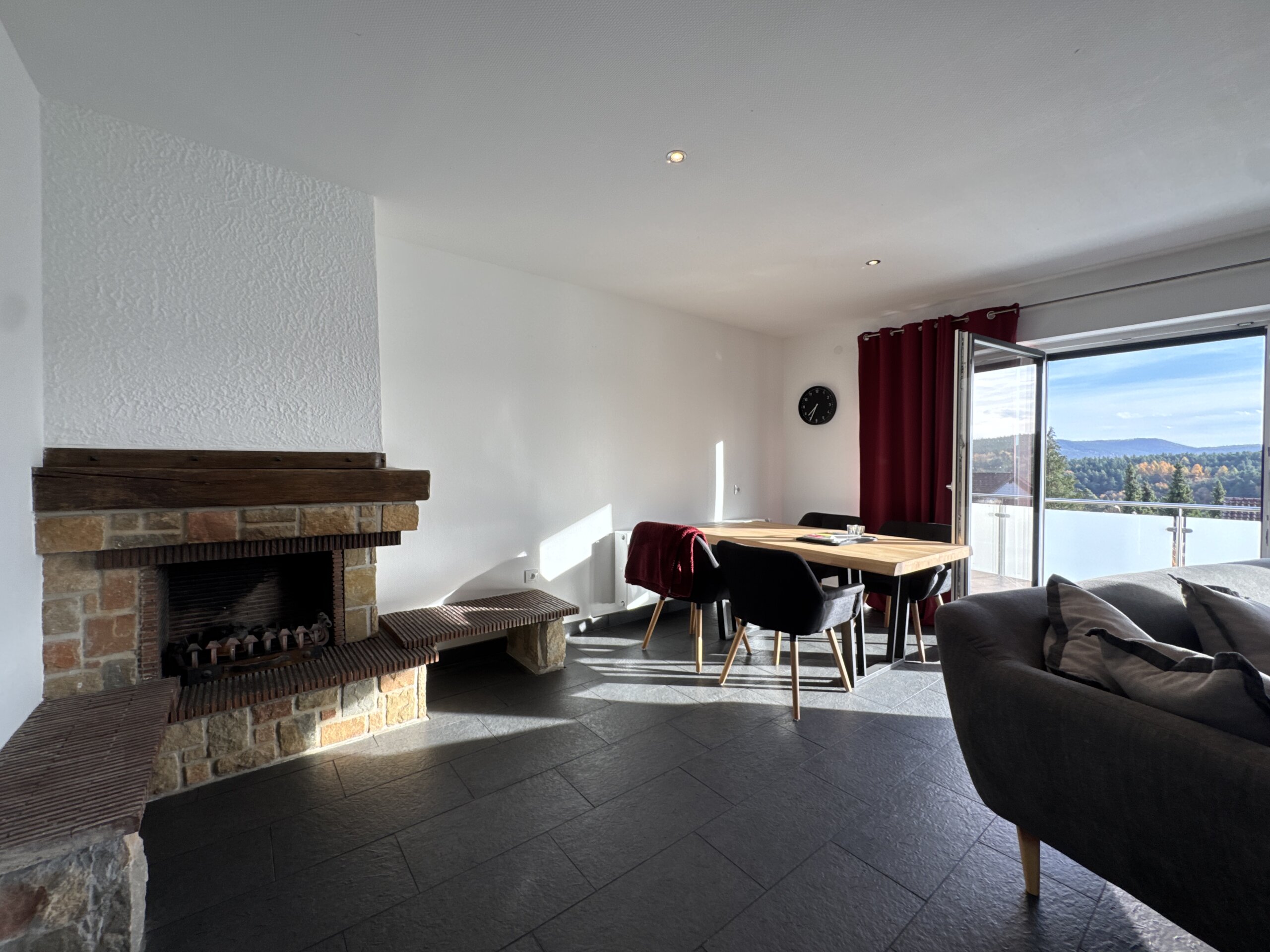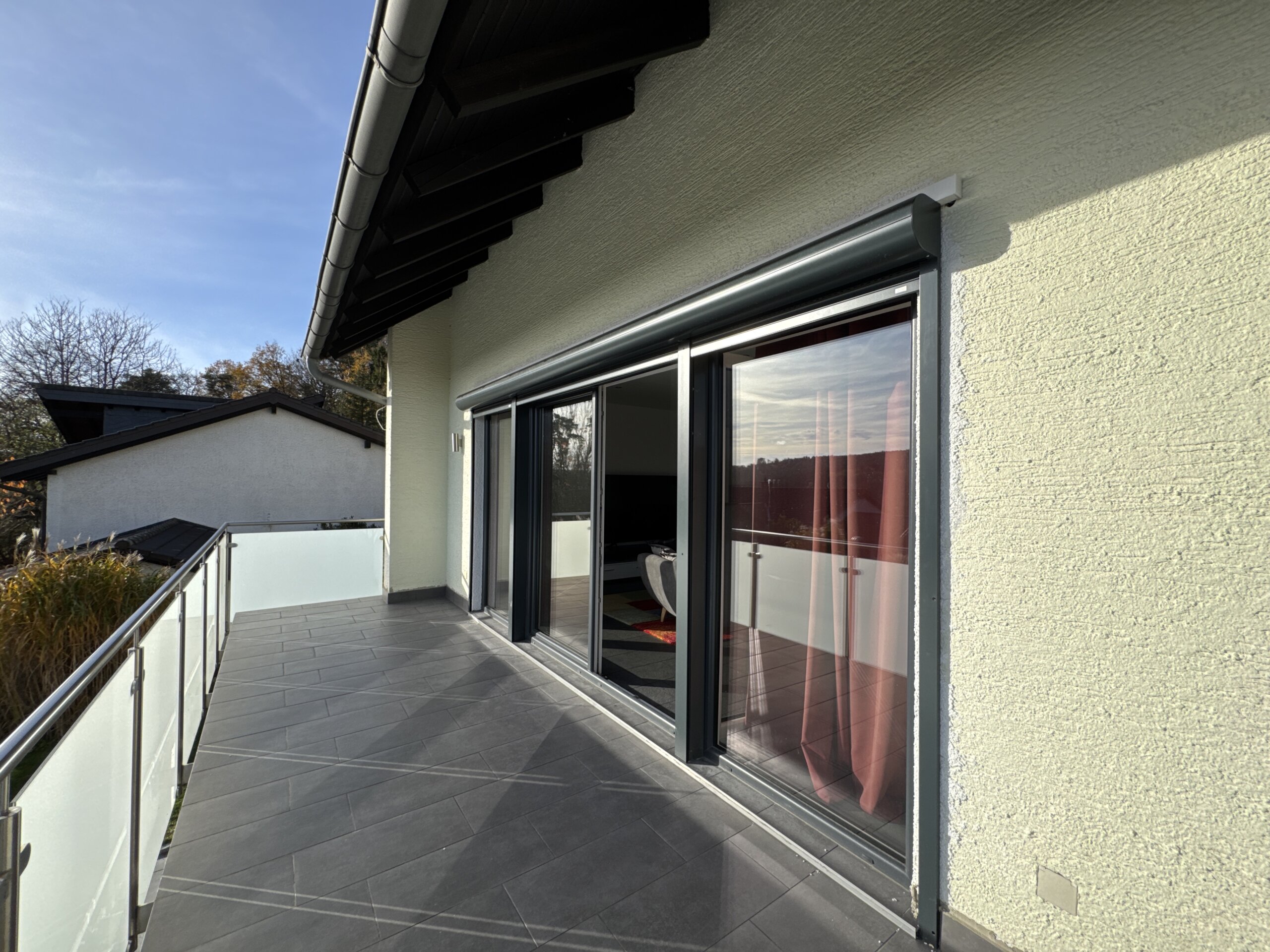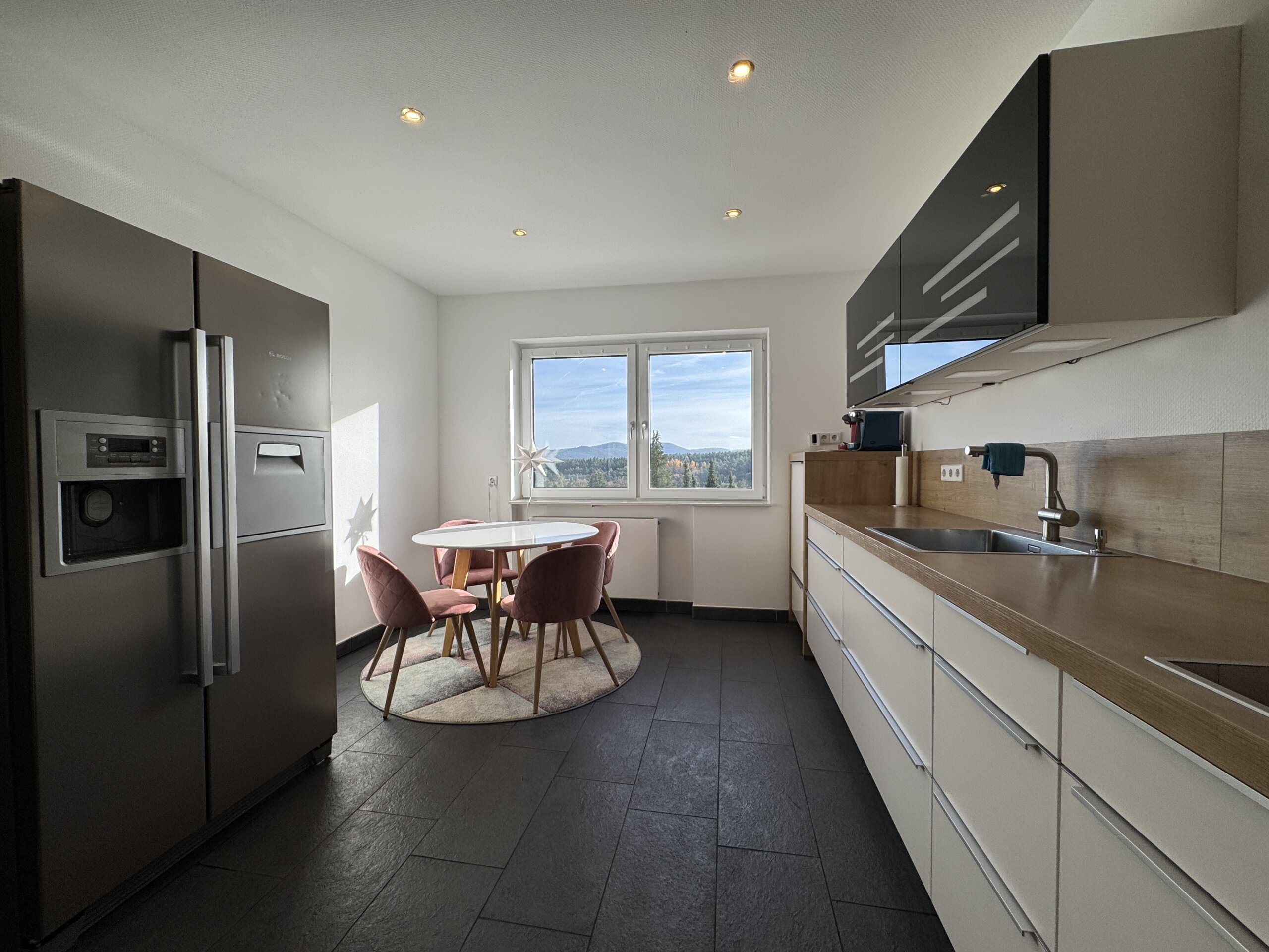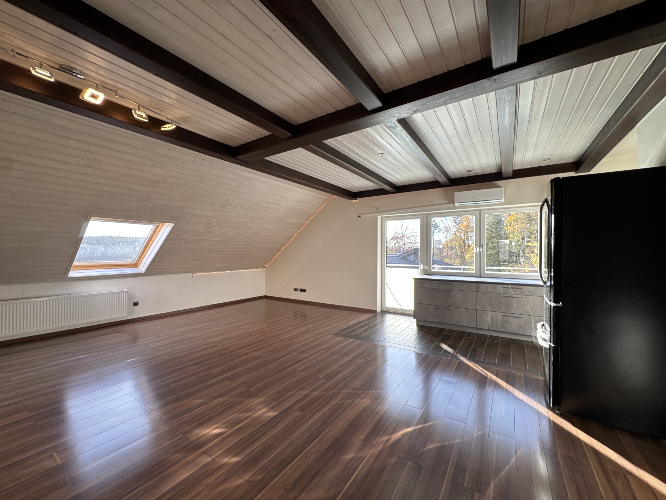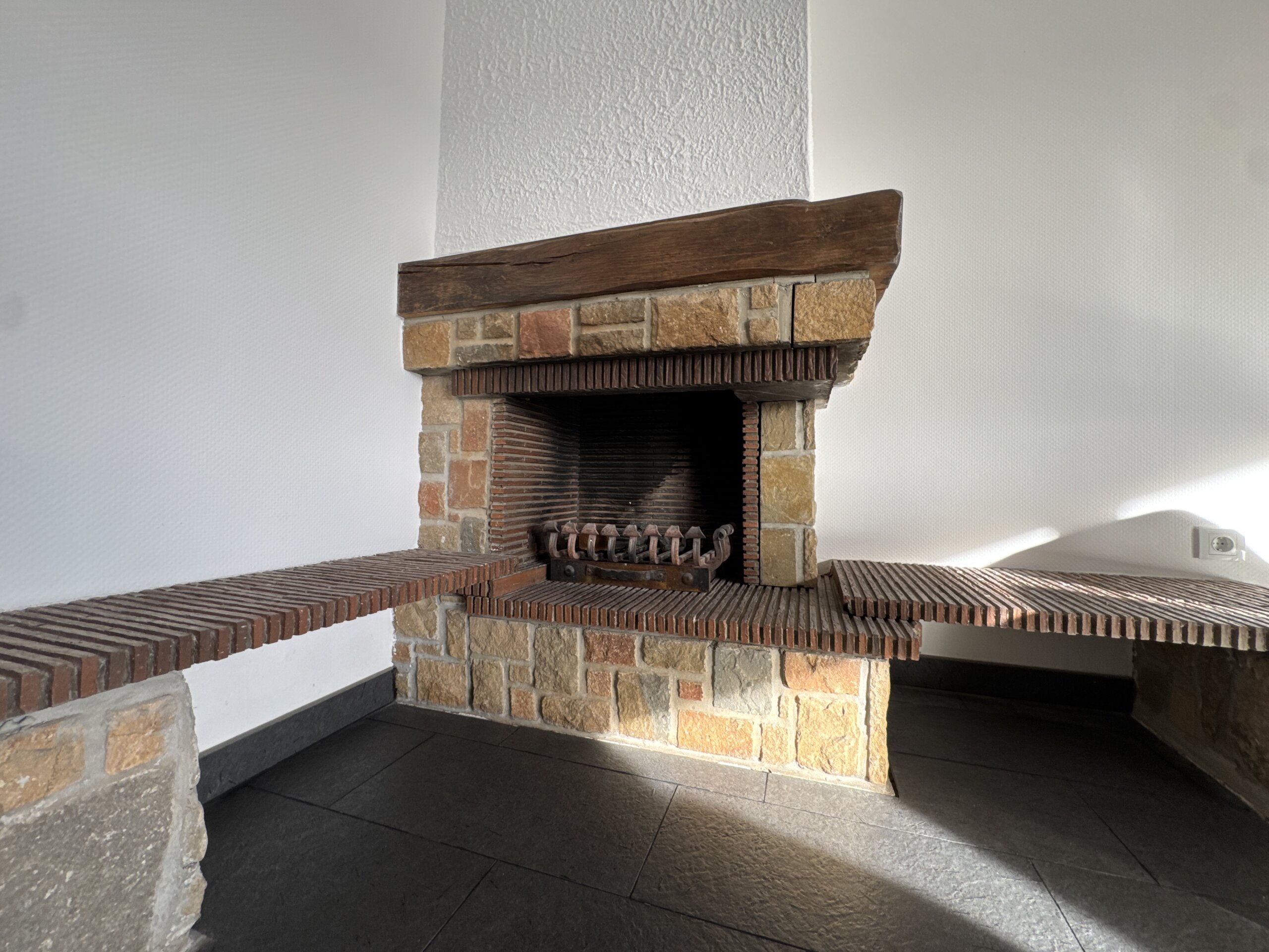 Der Wohnbereich mit offenem Kamin hat direkten Zugang zum breiten Süd-Balkon mit Blick über das Grundstück. Die offene Küche mit Essbereich ist großzügig angelegt und liegt ebenfalls zur Gartenseite. Drei Schlafzimmer sowie zwei modernisierte Tageslicht-Duschbäder strukturieren diese Ebene zu einer klaren, gut nutzbaren Wohnzone. Steinfliesen im Wohnbereich und Holzböden in den Schlafräumen unterstreichen den gepflegten Zustand.