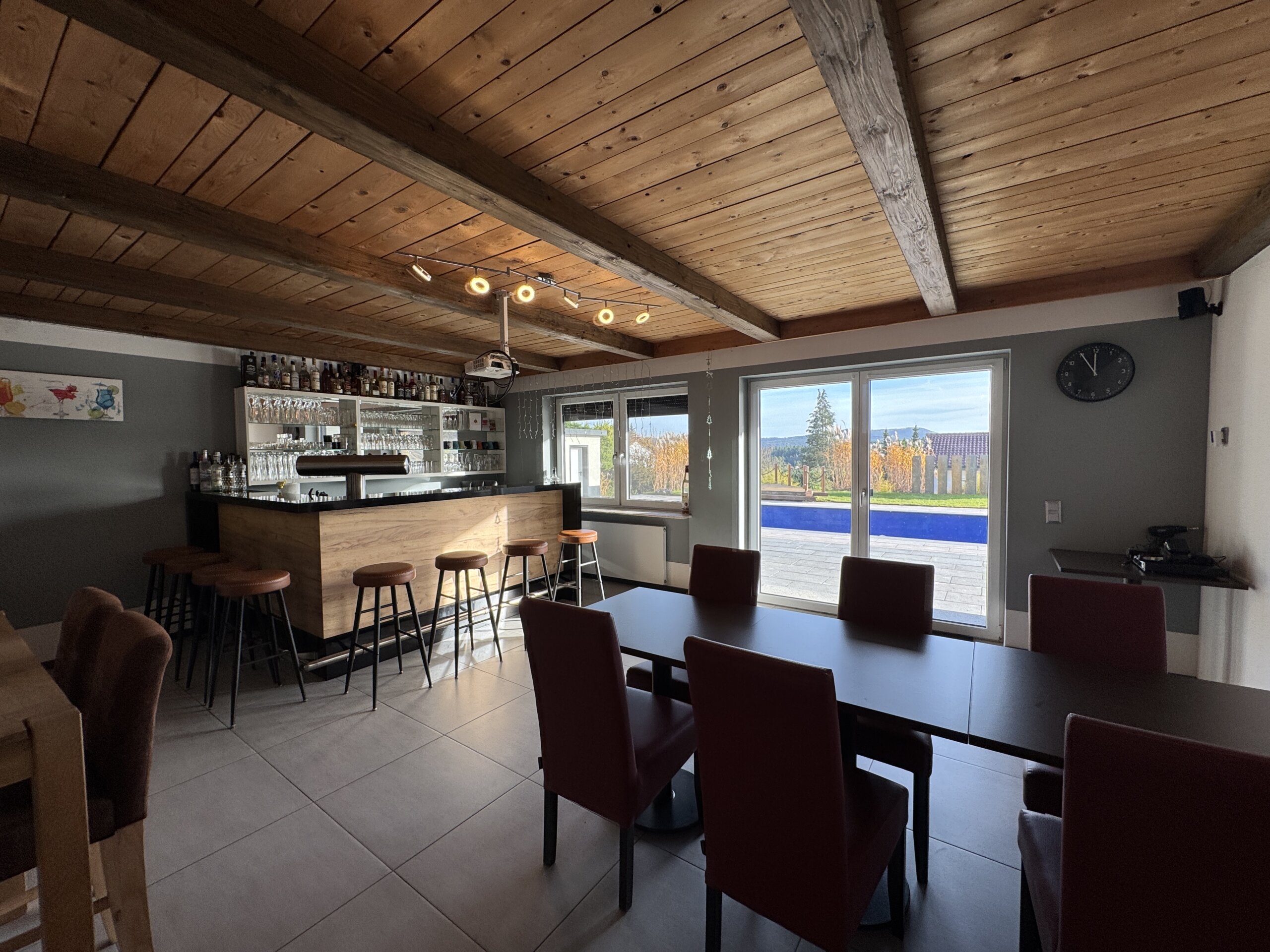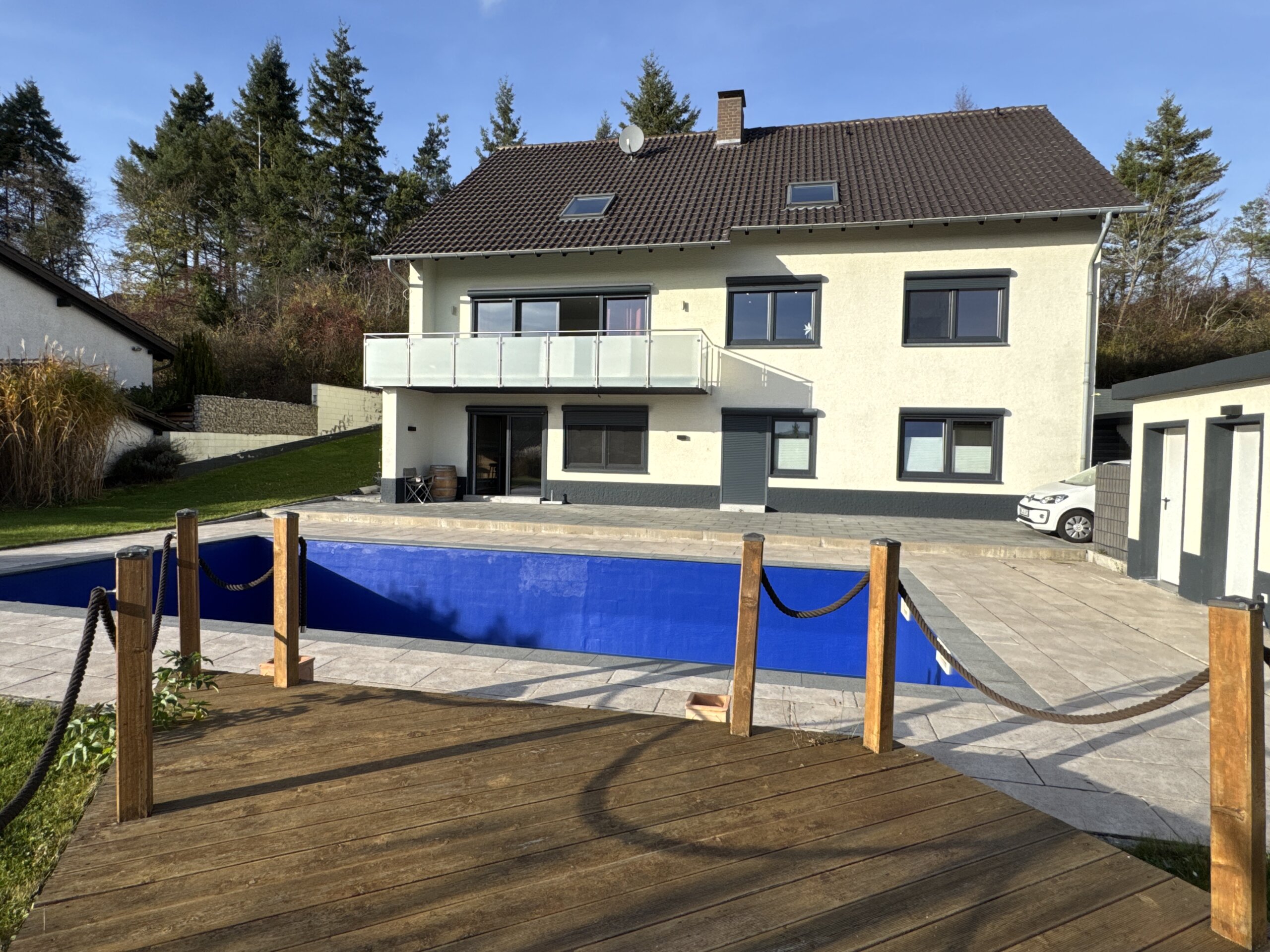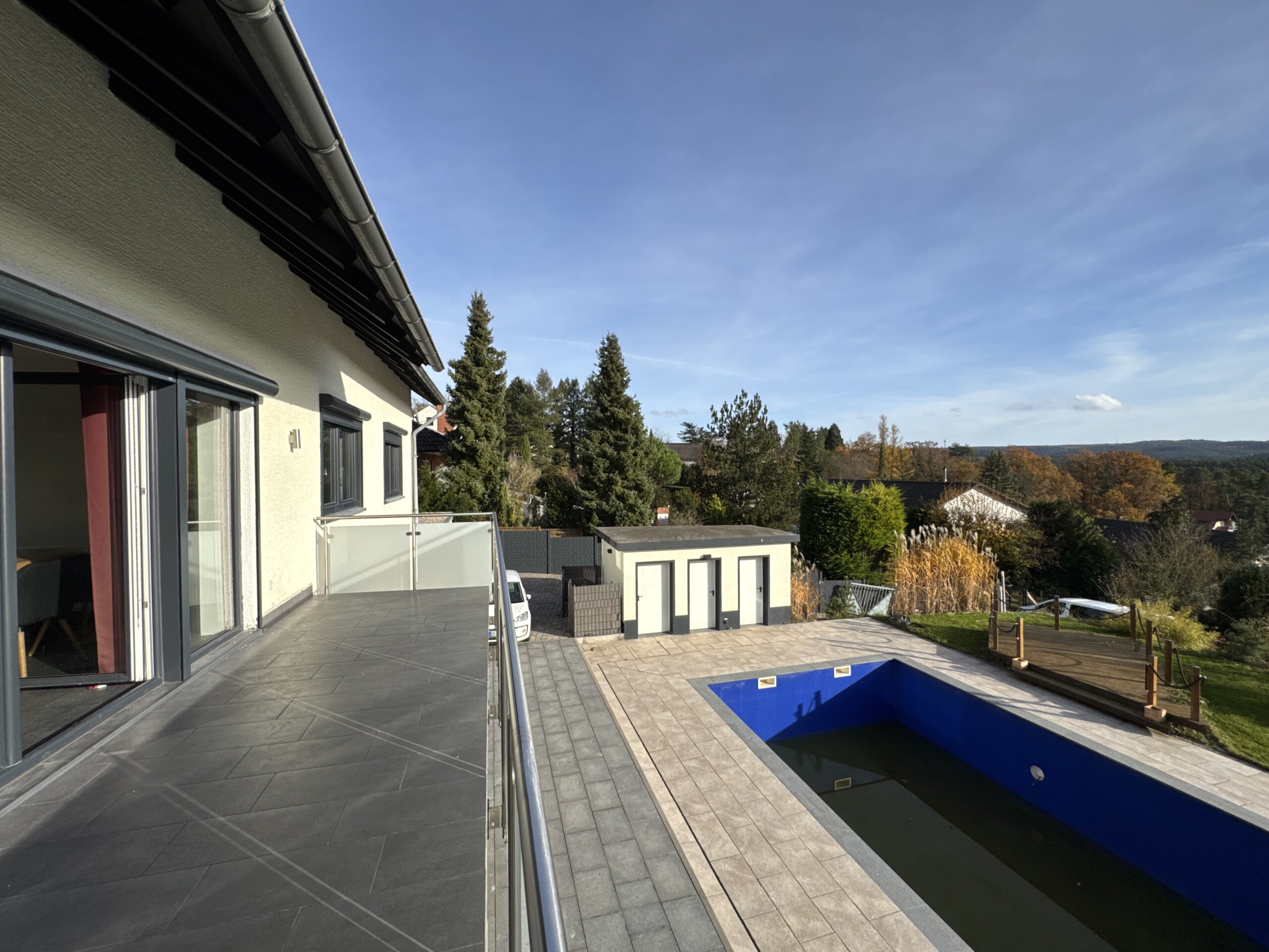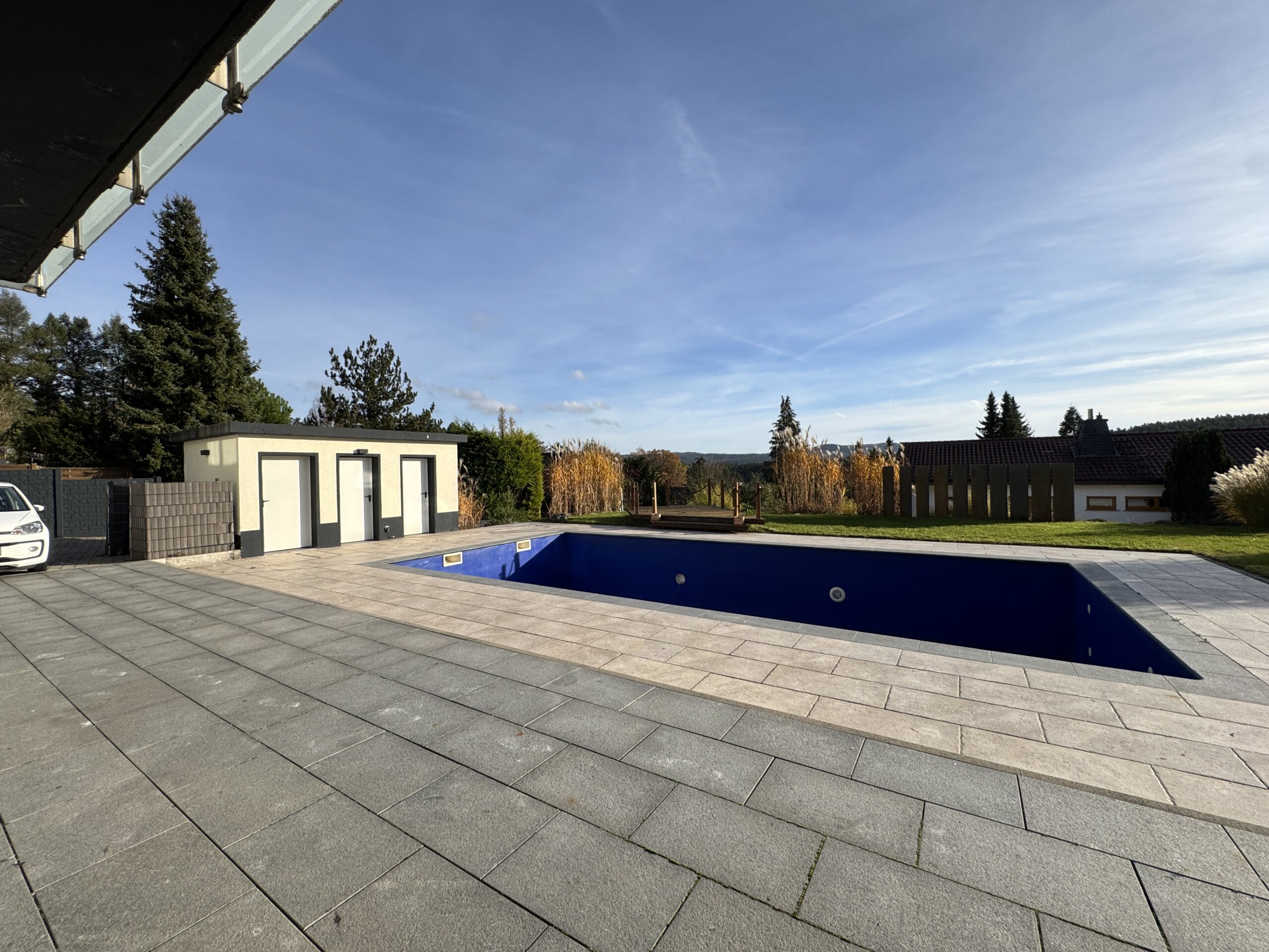 Von dort gelangt man zum separaten Duschbereich, in den Garten und zum 5 × 10 m großen Außenpool (ca. 1,50 m tief), der über eine Wärmepumpe beheizt wird. Ein eigenes Poolhaus mit Technikraum, zusätzlichen Lagerflächen, Dusche und WC ergänzt diesen Außen- und Wellnessbereich sinnvoll.